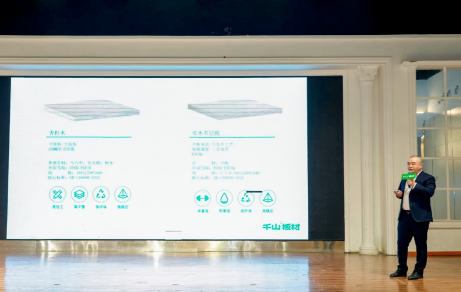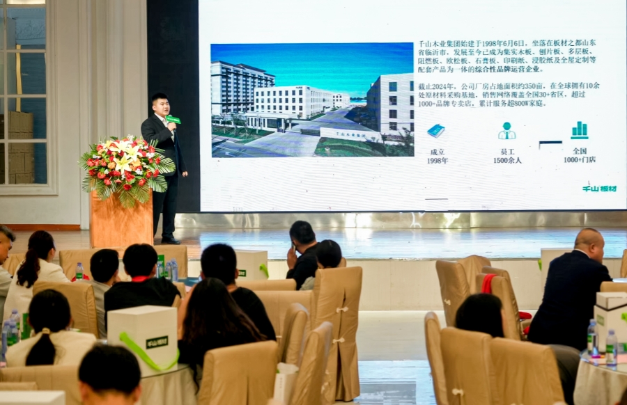 千山板材銷售部總監(jiān)董向陽上臺致辭。董總表示,千山堅定品牌高端化發(fā)展方向,堅定產(chǎn)品研發(fā)投入,堅定營銷渠道精進!站在全面發(fā)展的新階段,千山已做好充足準備,和伙伴們一起迎接挑戰(zhàn),合作共贏。