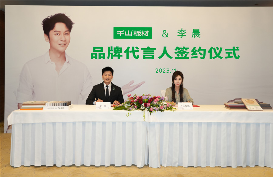 2023年11月,繼“時尚潮派衣柜 就選千山板材”全新廣告語推出后,千山再次迎來品牌戰略升級大動作,簽約實力派演員李晨為品牌代言人。簽約儀式在北京舉行,集團副董事長劉玉蓮出席簽約儀式,開啟了品牌的全新進階。