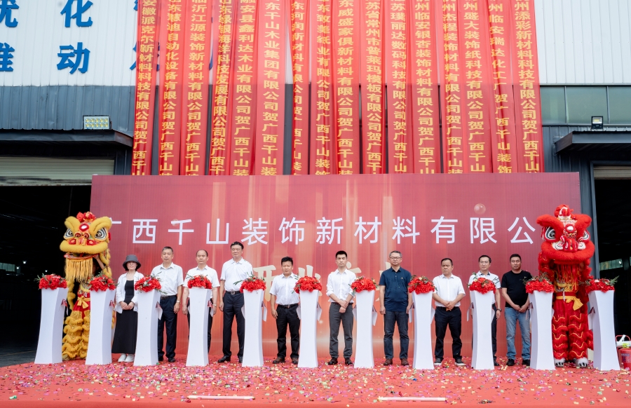 2024年5月25日,千山集團廣西生產基地盛大開業!作為專業的三聚氰胺浸漬紙和配套膠水供應商,廣西千山裝飾新材料有限公司占地面積15000平方米,計劃建設浸漬貼面紙生產線10條,年產浸漬貼面紙3000萬張,同時配套生產環保膠水。廣西基地的起航必將助力千山蓄長虹之勢,邁向發展新高峰!