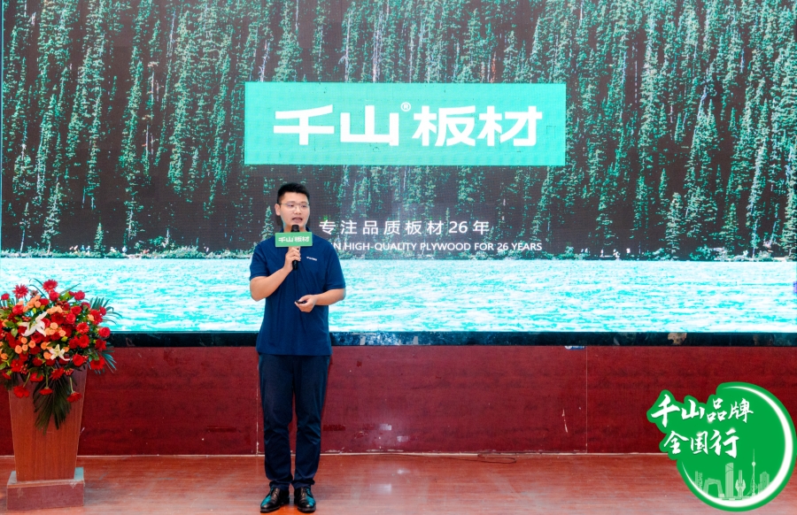 作為本次活動的產品推薦官,區域經理單記偉向大家詳細闡述了千山板材產品矩陣。爆品4大品類涵蓋實木刨片板(大/小)、實木多層板、實木板(香杉木);127款潮流花色包括木紋32、純色41、高定10、數碼24、布紋石紋8、門板12,充分滿足不同風格的色彩需求。
