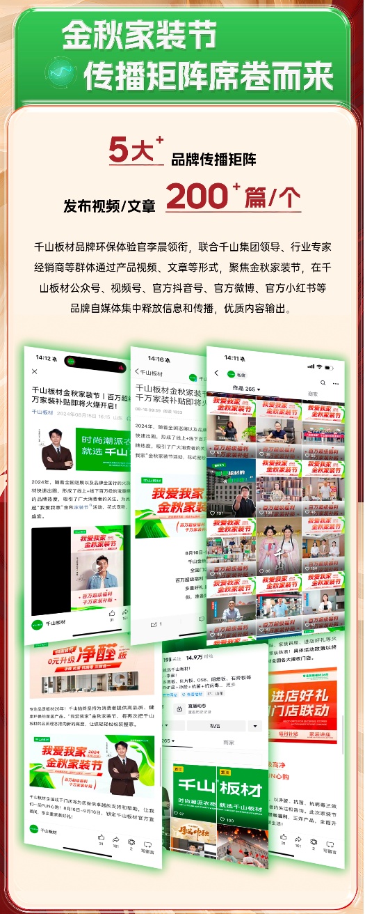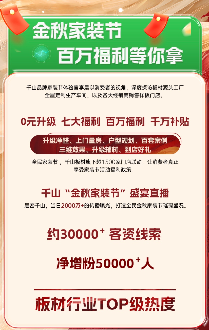 816日,千山金秋家裝節火爆上線,截至916日,為期30天的家裝節活動日前正式落下帷幕。活動期間,千山板材全國1500+門店聯動,全網曝光量超8500、線上直播觀看量超2000、簽約數量達3500+實現了品牌聲量和銷售業績的雙豐收!