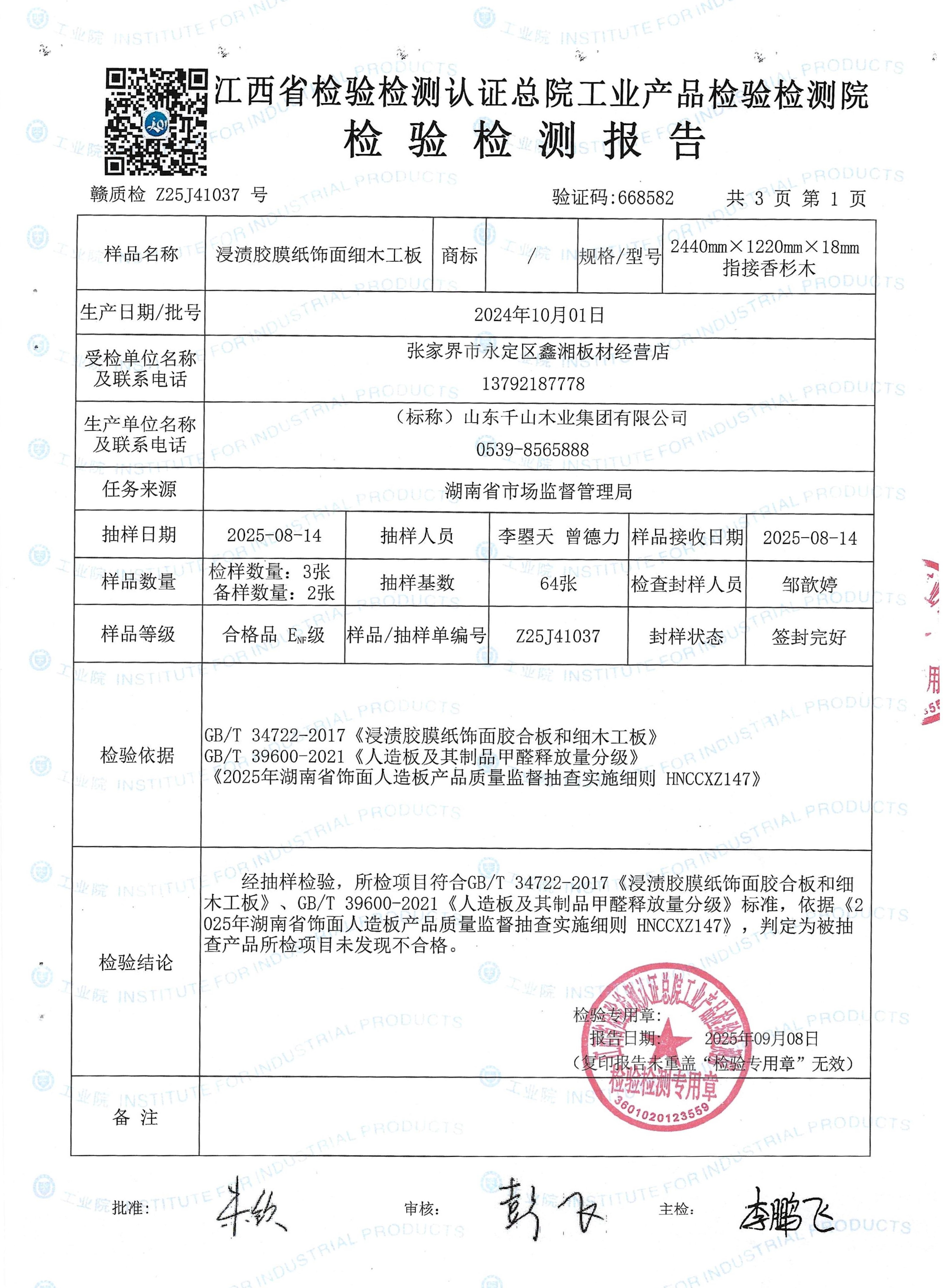 不同于企業自報的檢測數據,此次抽檢是由湖南省市場監督管理局主導的隨機性、公正性檢測,檢測結果更具公信力。千山板材能在此次抽檢中脫穎而出,不僅體現了對產品品質的嚴格把控,更證明了在環保與耐用性上的實力。