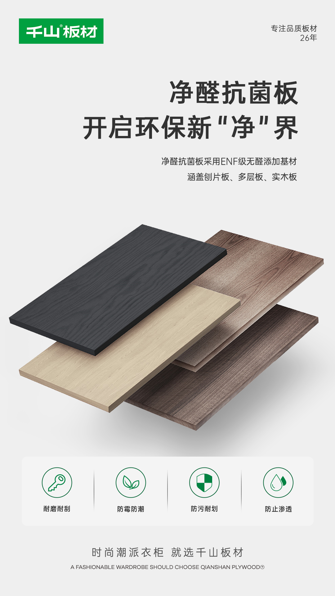 千山板材凈醛板采用ENF級無醛添加基材,涵蓋刨片板、多層板、實木板,以六大硬核優勢強效發力,凈醛、抗菌、抗病毒三效合一,開啟環保新“凈”界,從源頭打造“無醛”之家。