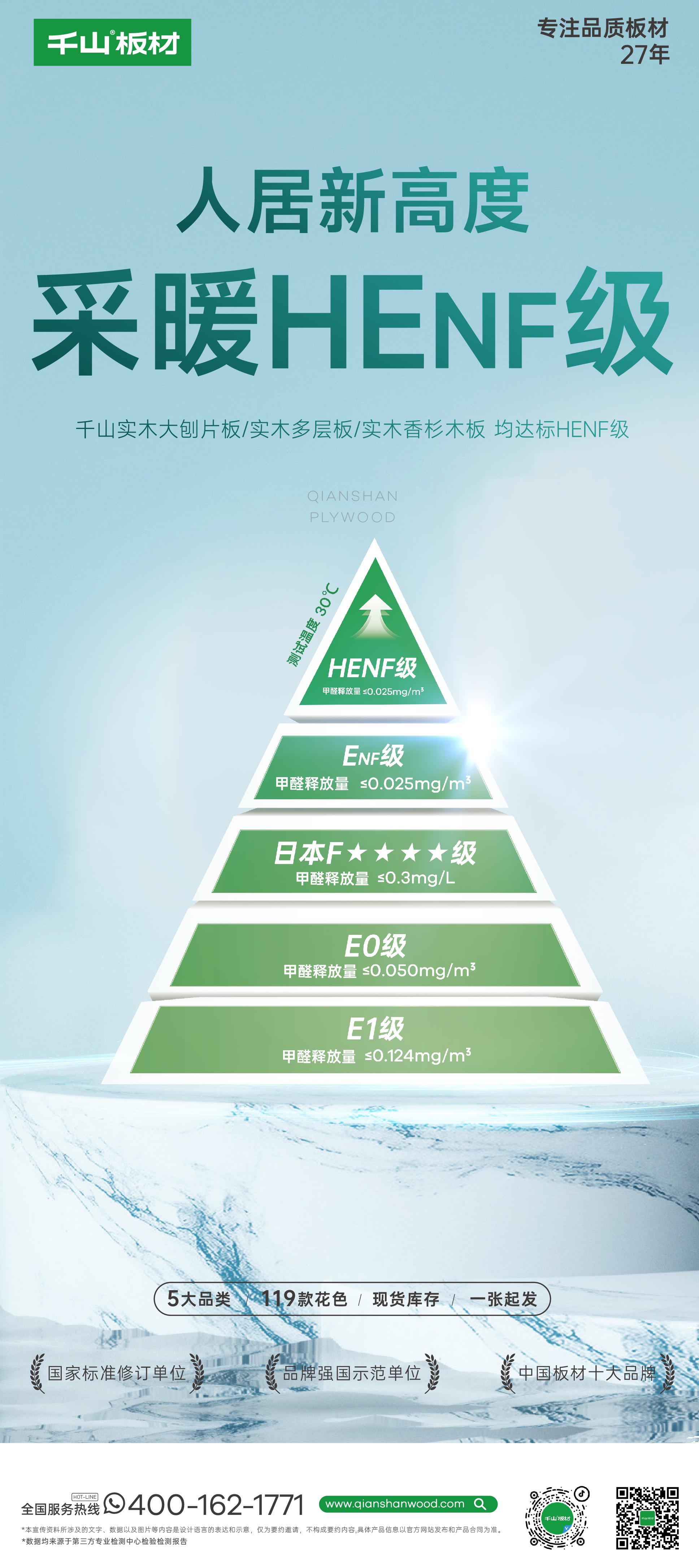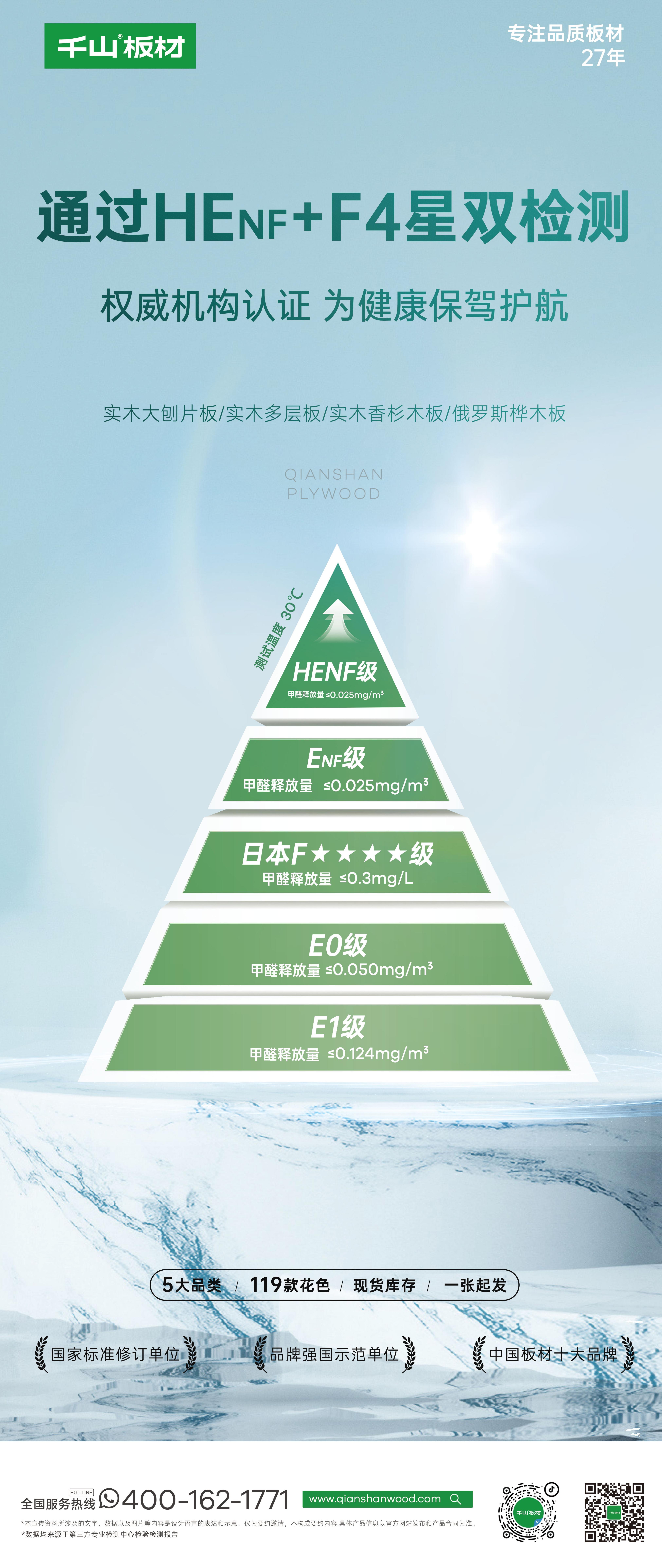 HENF級板材以極低的甲醛釋放量和嚴格的測試條件,成為目前國內外最嚴格的環(huán)保等級之一,適合用于各種高溫和采暖環(huán)境,為消費者提供了更健康、更安全的家居選擇。千山板材不僅以技術硬實力搶占環(huán)保制高點,更以用戶需求為中心,重新定義了健康家居的高標準。