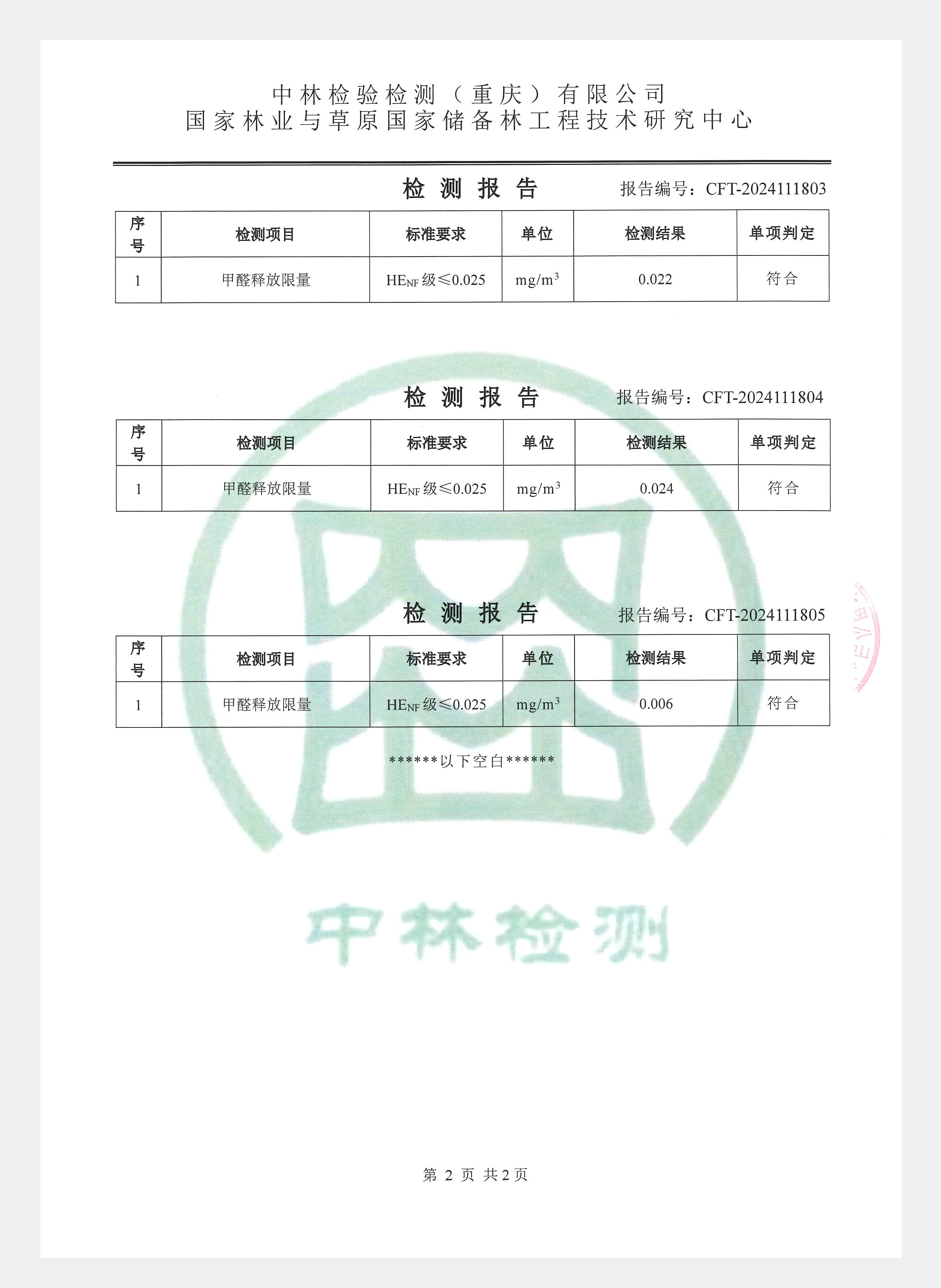 經(jīng)權威機構檢測,30℃熱環(huán)境下,千山實木大刨片甲醛釋放量為0.006mg/m3,實木多層板甲醛釋放量為0.022mg/m3,實木香杉木甲醛釋放量為0.024mg/m3,均達HEnf標準要求,同時通過ENF級和F4星雙環(huán)保檢測。