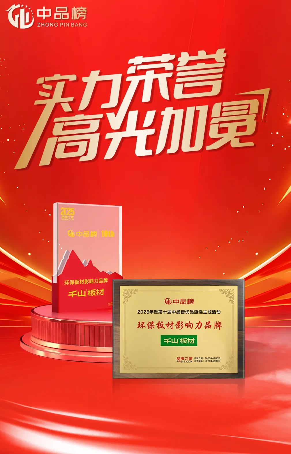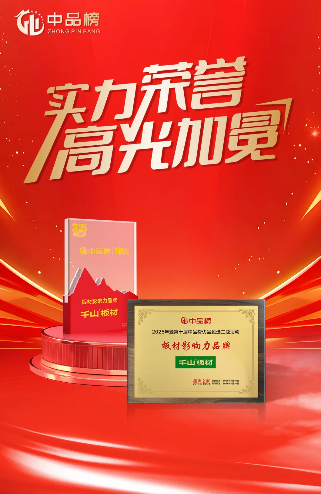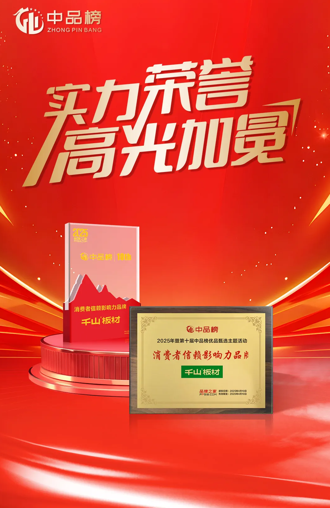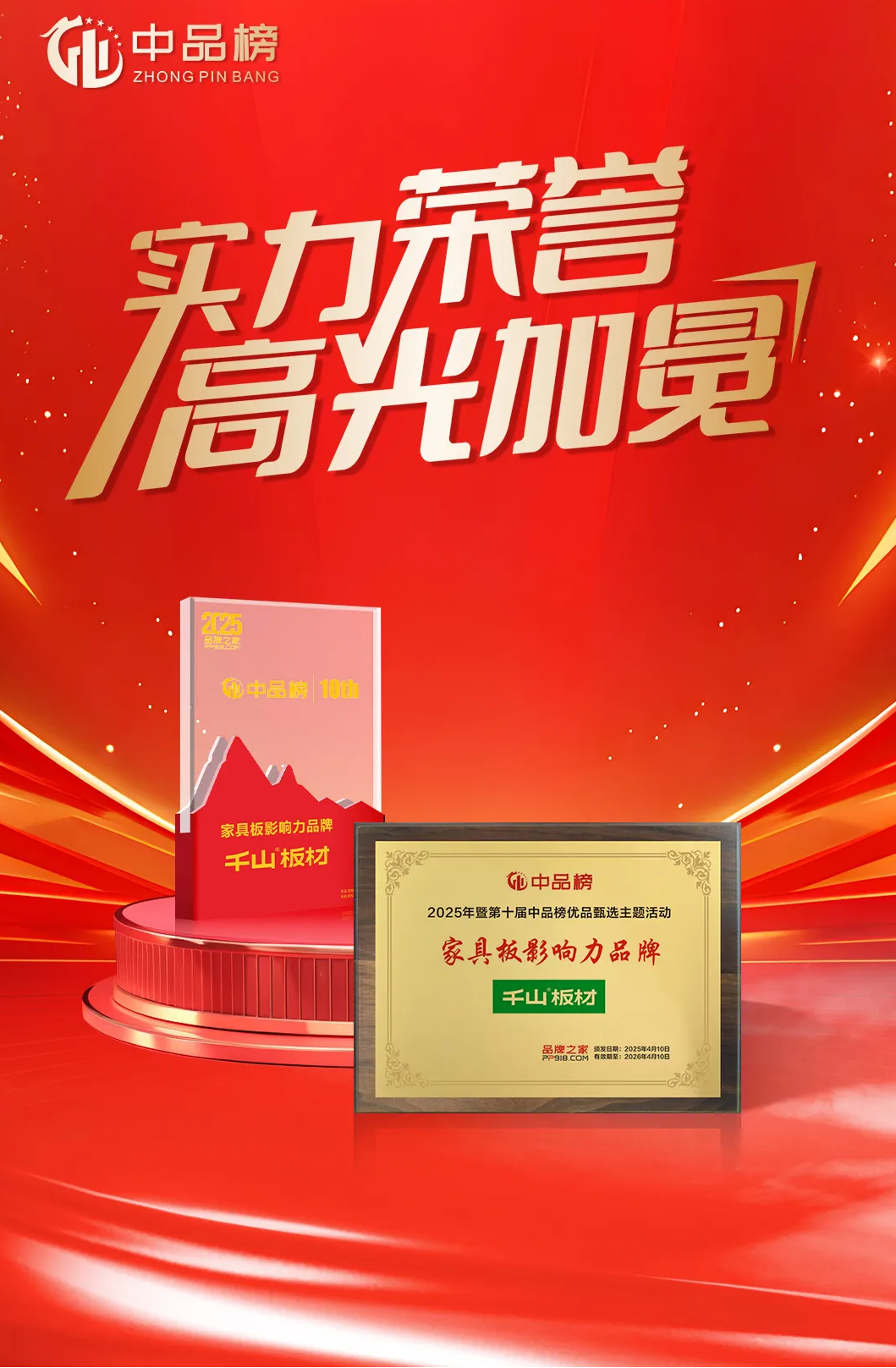 2025年4月,歷時三個多月的第十屆“中品榜”優品甄選活動圓滿落幕,板材大品牌榜單正式揭曉!千山板材憑借卓越產品力和強大市場表現力,再次成為行業焦點,斬獲四項重量級大獎:“板材十大品牌”、“環保板材十大品牌”、“家具板十大品牌”、“消費者信賴十大品牌”。