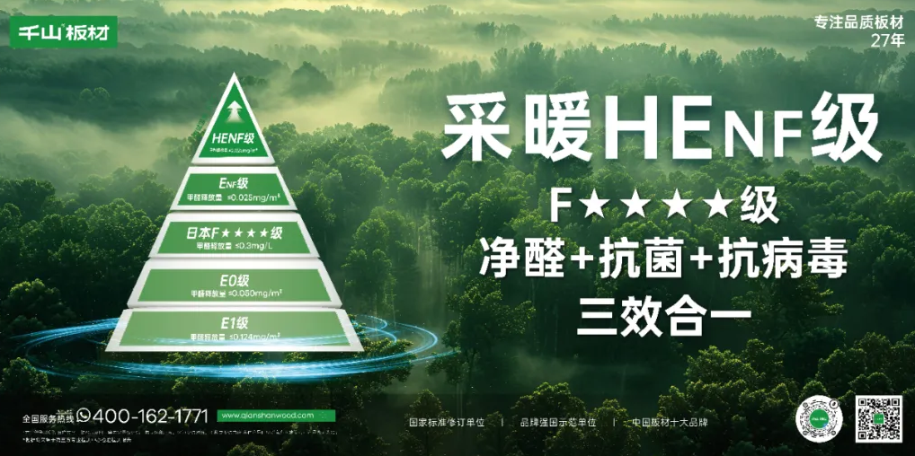 千山板材通過國標ENF級和F4星雙環保檢測,進階HEnf采暖級環保標準,占領“采暖無醛級”環保制高點。在滿足消費者對產品的高品質、高環保需求后,全面升級推出凈醛、抗菌、抗病毒三效合一的凈醛板,為消費者打造高凈品質生活。