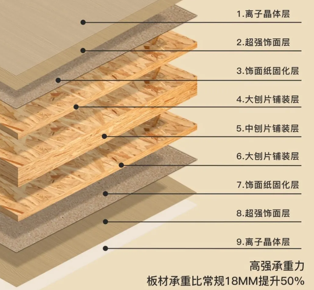 采用德國迪芬巴赫連續(xù)平壓線生產(chǎn),內(nèi)芯刨片均勻縱橫交錯壓合。5層定向鋪裝結(jié)構(gòu),使其內(nèi)結(jié)合強(qiáng)度更高,從而賦予了離子晶體板穩(wěn)定堅韌的特性,能夠經(jīng)受住南北方特殊氣候考驗,耐用周期延長10年。