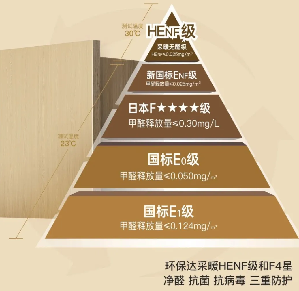 采用無醛MDI膠,生產(chǎn)全過程無醛添加,環(huán)保達(dá)采暖HENF級,同時通過F4星環(huán)保標(biāo)準(zhǔn)檢測,以“雙環(huán)?!敝睋舾攮h(huán)保客群需求。離子晶體板在北方供暖及南方濕熱環(huán)境條件下,甲醛釋放量仍可保持極低水平。