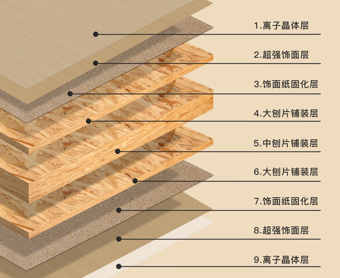 定向鋪裝芯層+固化層+離子晶體層,穩定堅韌結構能夠經受南北方環境考驗,規避門板變形和表層開裂問題。